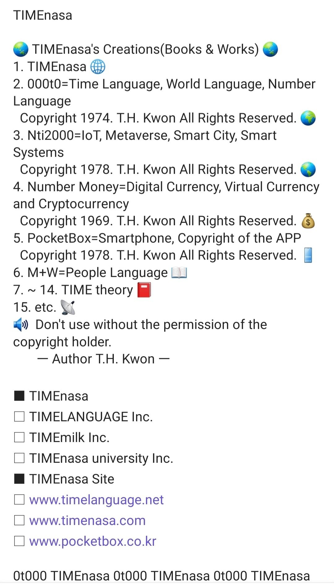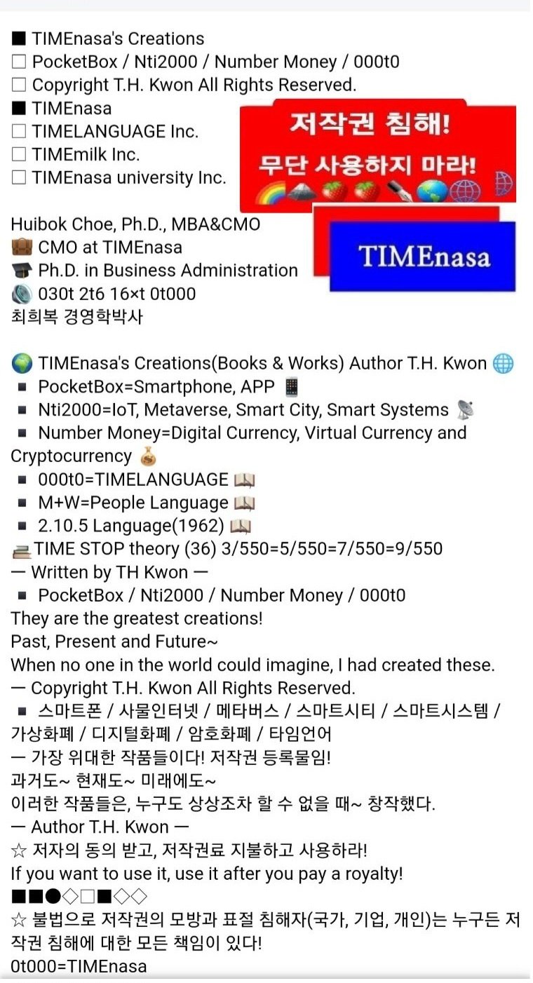 We're introducing Time Language all over the world. Time Language is the world's language consisting of numbers that anyone in the world can easily use. Time Language frees us from foreign languages. Now, there is no need for interpretation and translation. Time Language is pronounced in the language of each country and the meaning is the same. [000t0=Time Language, Copyright 1974. T.H. Kwon All Rights Reserved.] Looking forward to our interactions. Thank you. Huibok Choe, Ph.D.