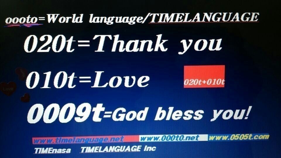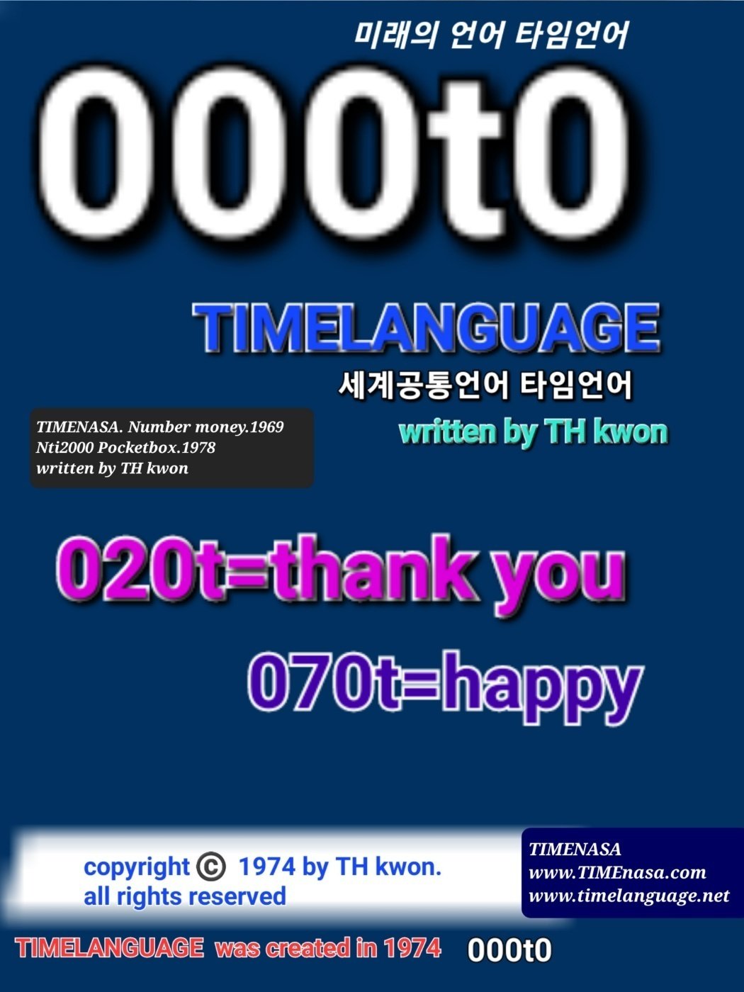 We're introducing Time Language all over the world. Time Language is the world's language consisting of numbers that anyone in the world can easily use. Time Language frees us from foreign languages. Now, there is no need for interpretation and translation. Time Language is pronounced in the language of each country and the meaning is the same. [000t0=Time Language, Copyright 1974. T.H. Kwon All Rights Reserved.] Looking forward to our interactions. Thank you. Huibok Choe, Ph.D.