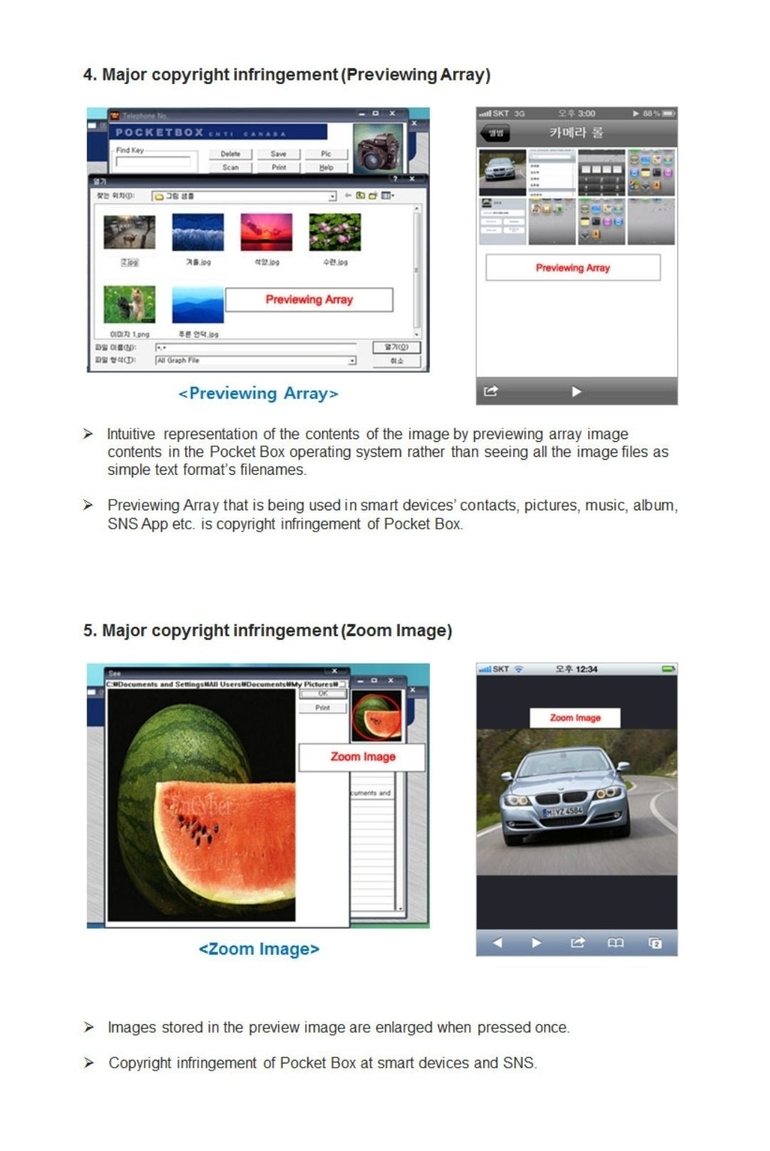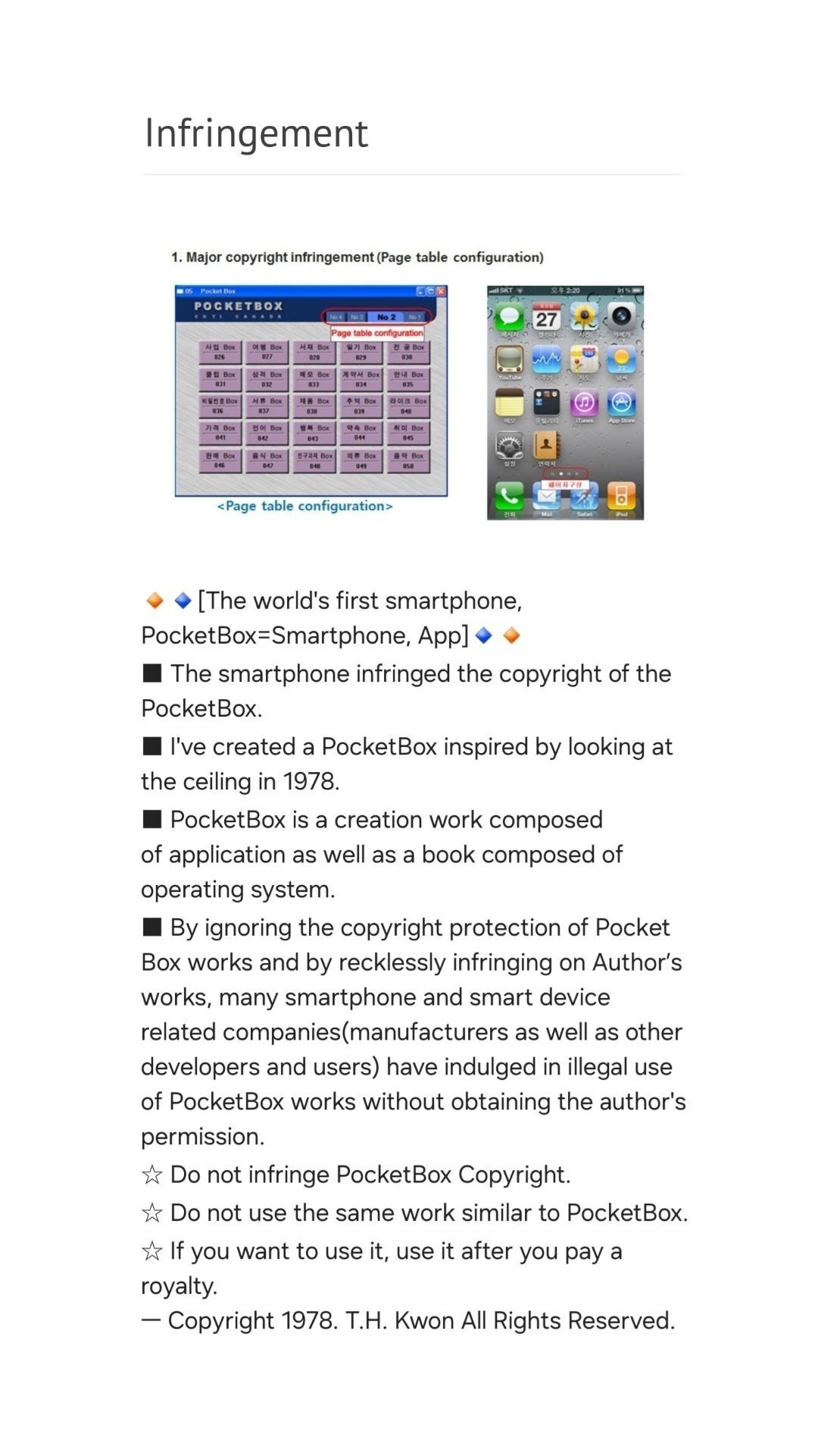 ■ By ignoring the copyright protection of Pocket Box works and by recklessly infringing on Author’s works, many smartphone and smart device related companies(manufacturers as well as other developers and users) have indulged in illegal use of PocketBox works without obtaining the author's permission.