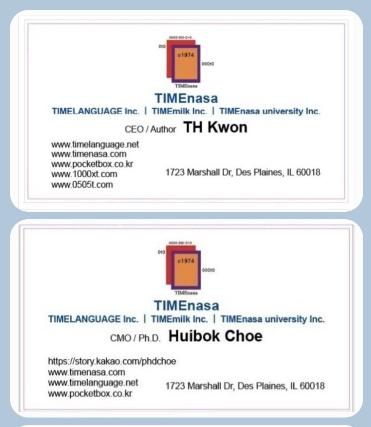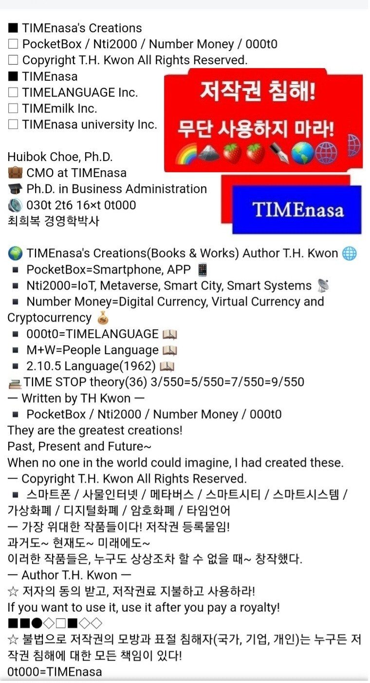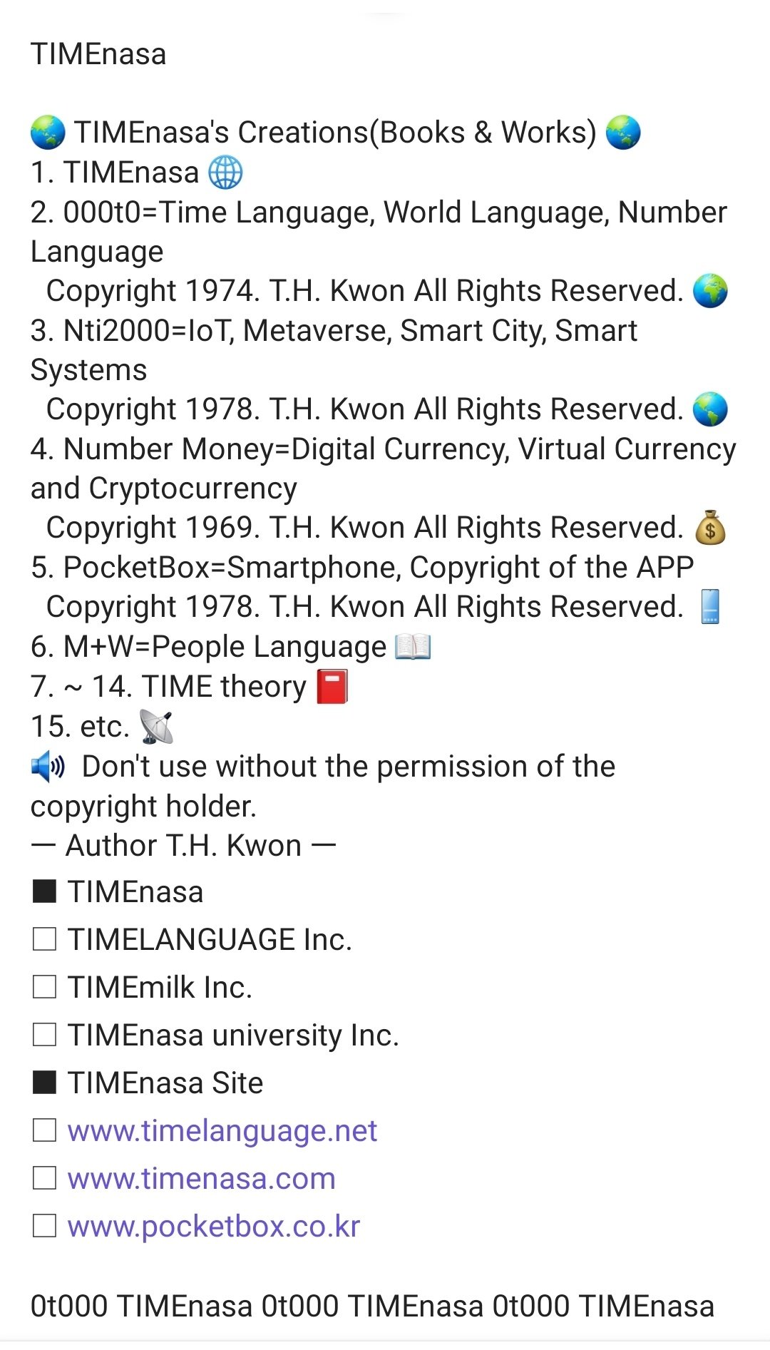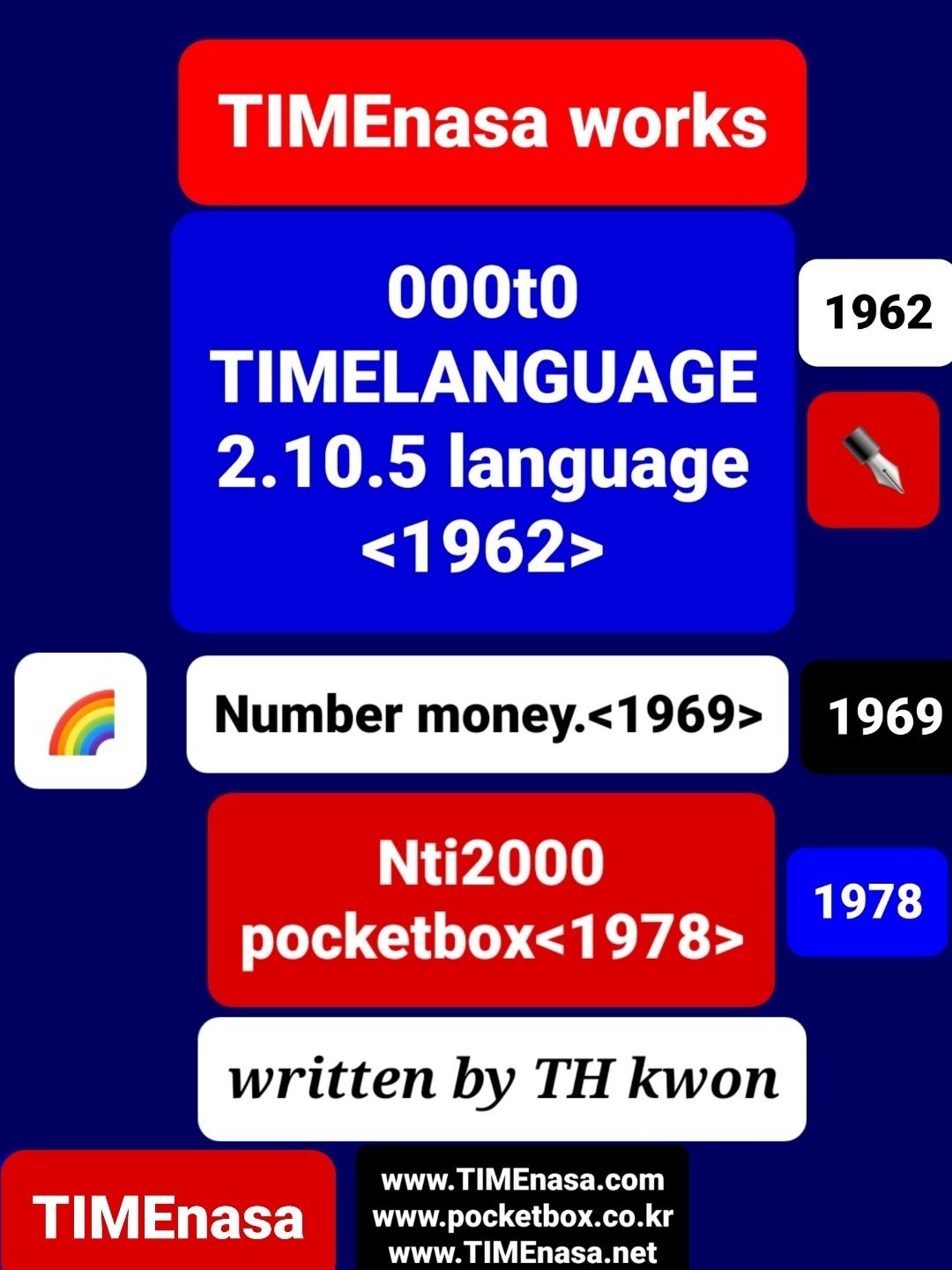 We're introducing Time Language all over the world. Time Language is the world's language consisting of numbers that anyone in the world can easily use. Time Language frees us from foreign languages. Now, there is no need for interpretation and translation. Time Language is pronounced in the language of each country and the meaning is the same. [000t0=Time Language, Copyright 1974. T.H. Kwon All Rights Reserved.] Looking forward to our interactions. Thank you. Huibok Choe, Ph.D.