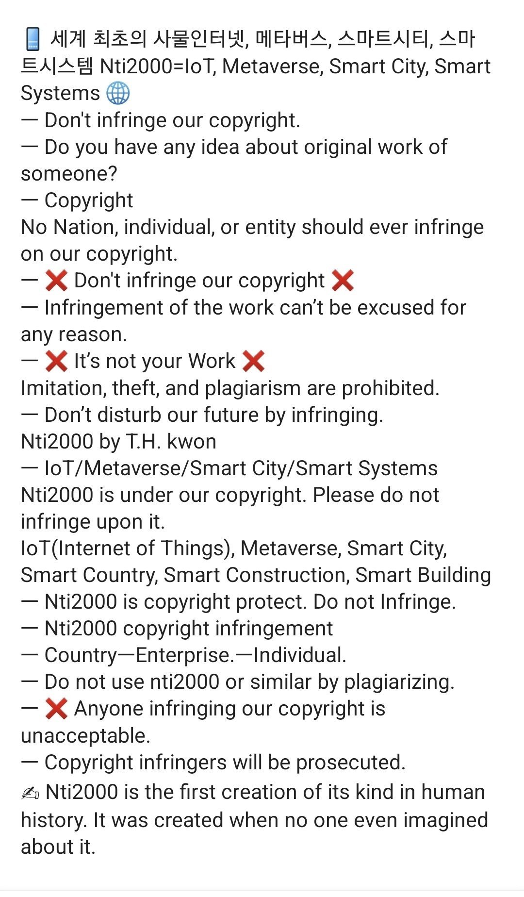 ㅡ 사물인터넷(IoT), 메타버스(Metaverse), 스마트시티(Smart City), 스마트시스템(Smart Systems) 등은 Nti2000 저작물의 명칭만 변경해서 사용하고 있다. Nti2000 저작권 침해하지 마라!