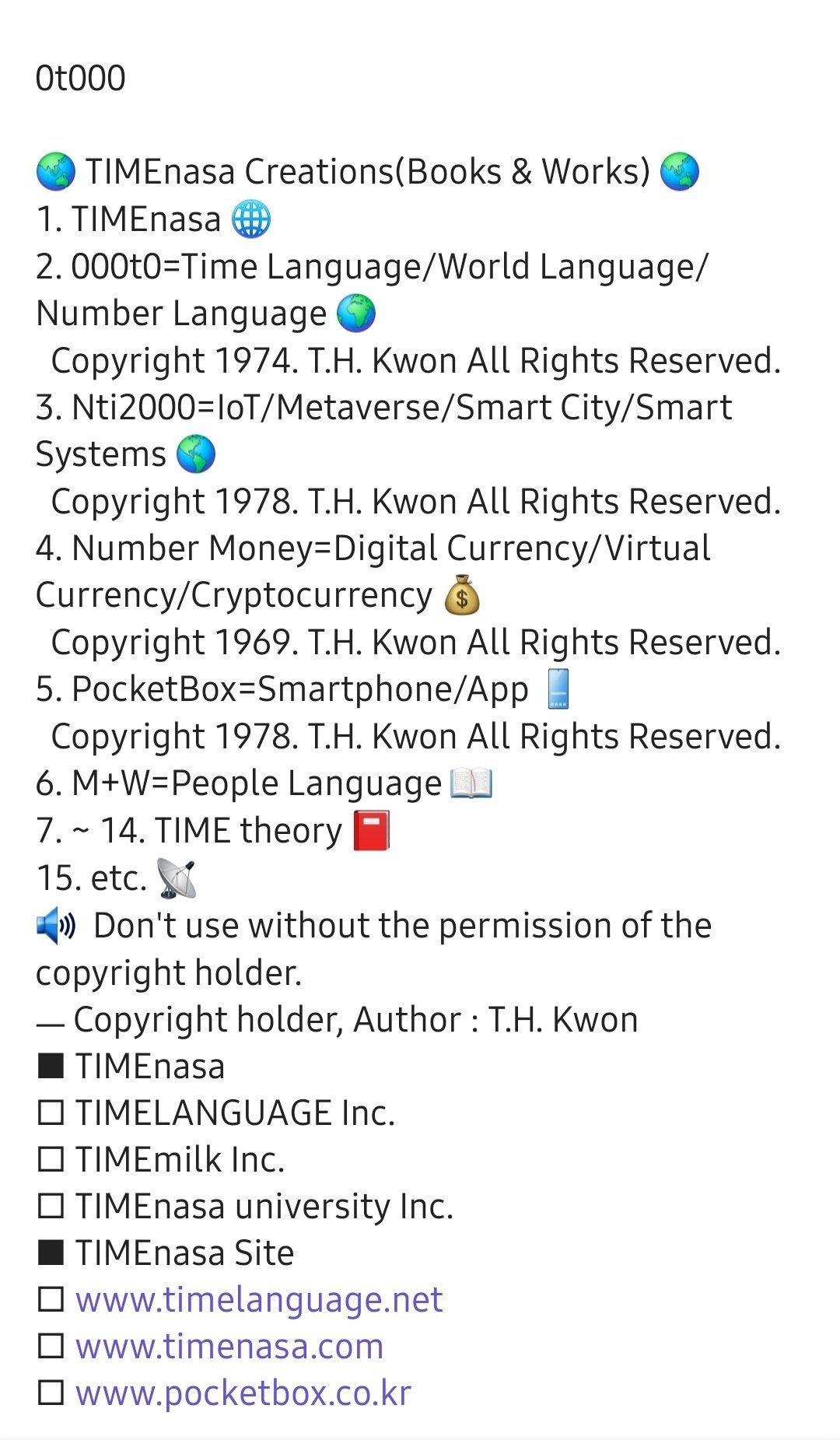 000t0=Time Language, AI Language, Common Language, Computer Language, Digital Language, Future Language, Global Language, ICT Language, International Language, Internet Language, IoT Language, Link Language, Number Language, Program Language, SNS Language, Thinking Language, TNS Language, Universal Language, and World Language